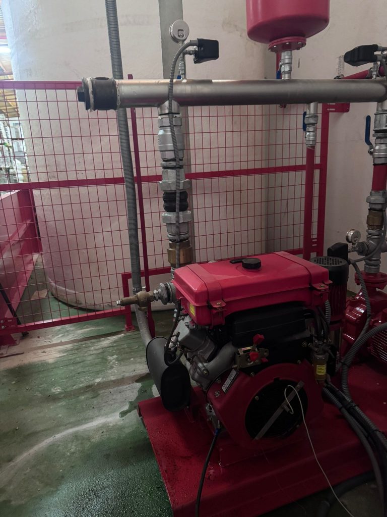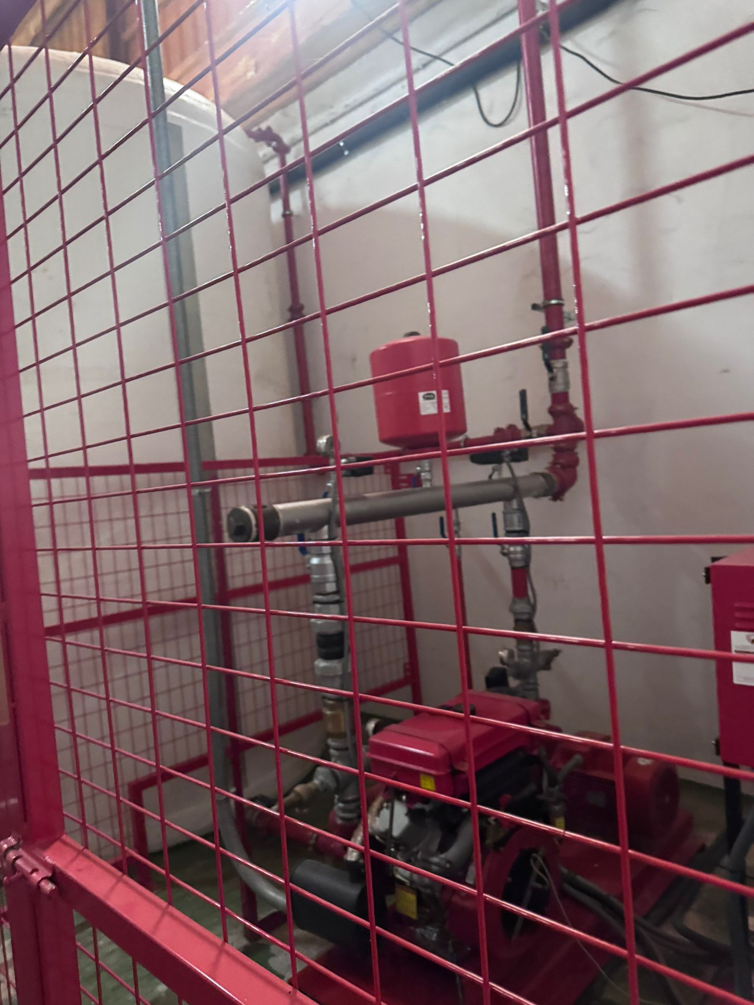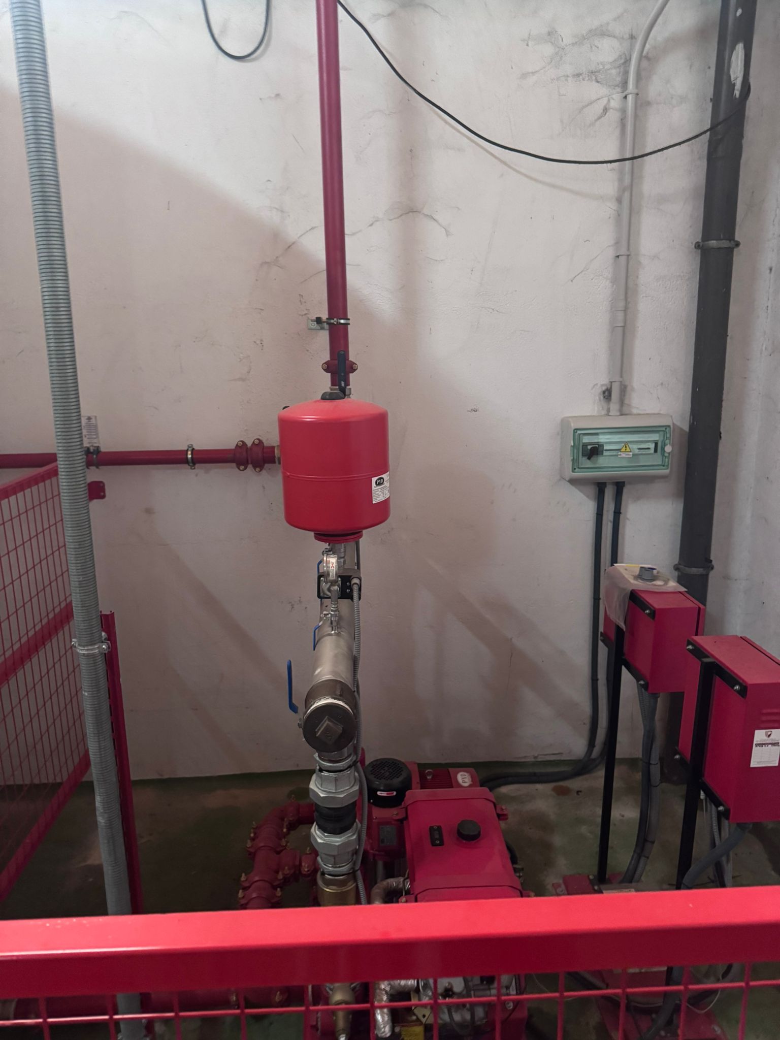 Realizamos la instalación completa del sistema contra incendios en sala técnica, incorporando grupo de presión con bomba diésel y cuadro de control, colectores y tubería de acero pintada en rojo, válvulas de seccionamiento, manómetros y presostatos para supervisión de presión. Se ejecutaron las conexiones hidráulicas y eléctricas, canalizaciones y protecciones, dejando el conjunto ordenado y accesible para mantenimiento.